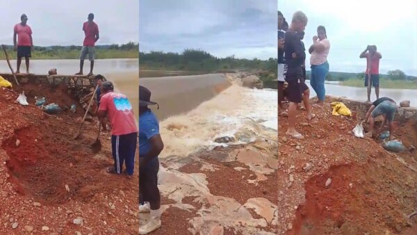 Diante do cenário, os próprios moradores iniciaram uma mobilização emergencial. Utilizando sacos com entulho e outros materiais improvisados, eles tentam reforçar os pontos mais críticos da barragem para conter a água e evitar um possível rompimento.