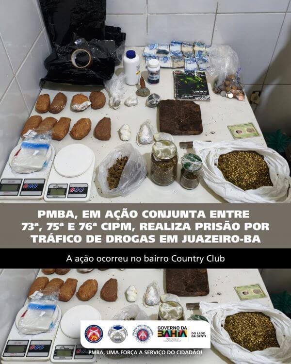 Neste sábado (14), policiais militares da 75ª Companhia Independente de Polícia Militar (CIPM), em ação conjunta com as 73ª e 76ª CIPM, realizaram a prisão de um suspeito por tráfico de drogas no bairro Country Club, em Juazeiro-BA.