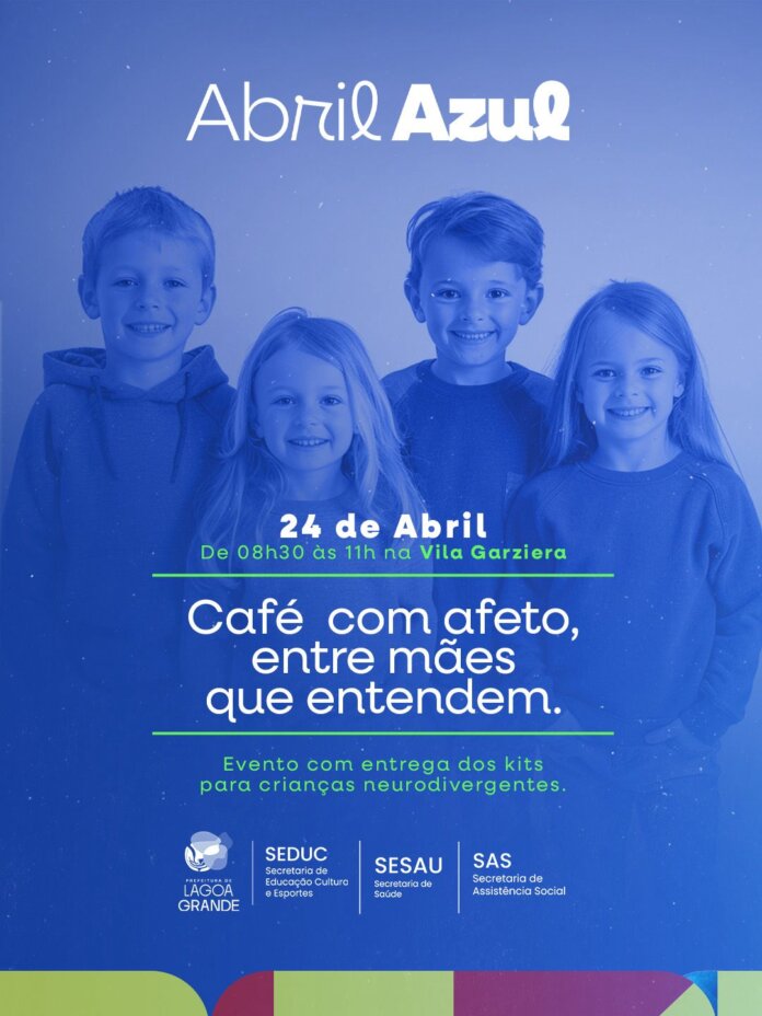 A Prefeitura de Lagoa Grande, através das secretarias de Educação (Seduc), Assistência Social (SAS) e Saúde (Sesau), realiza nesta quinta-feira (24/04) o evento “Café com Afeto”. A programação terá início às 8h30 na Villa Garziera, e é voltado para mães atípicas de estudantes da rede com o Transtorno do Espectro Autista (TEA), reforçando o compromisso da gestão com a inclusão e o cuidado.